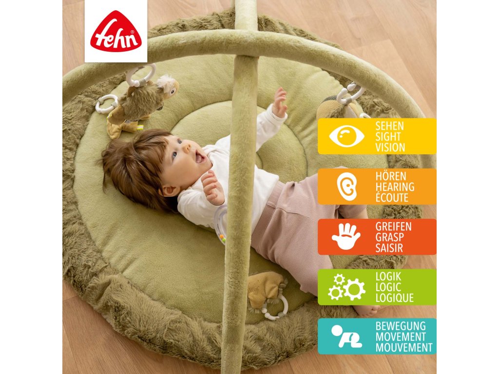 Na dvou hrazdičkách jsou zavěšeny další hračky: chrastítko s kroužky, skrytá rolnička v míčku, zrcátko a chameleon se zvířecím zvukem. Tyto prvky upoutají pozornost dítěte, prodlouží dobu soustředění a přinesou radost ze hry.