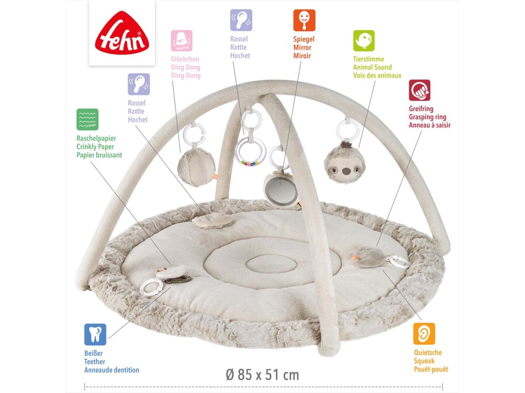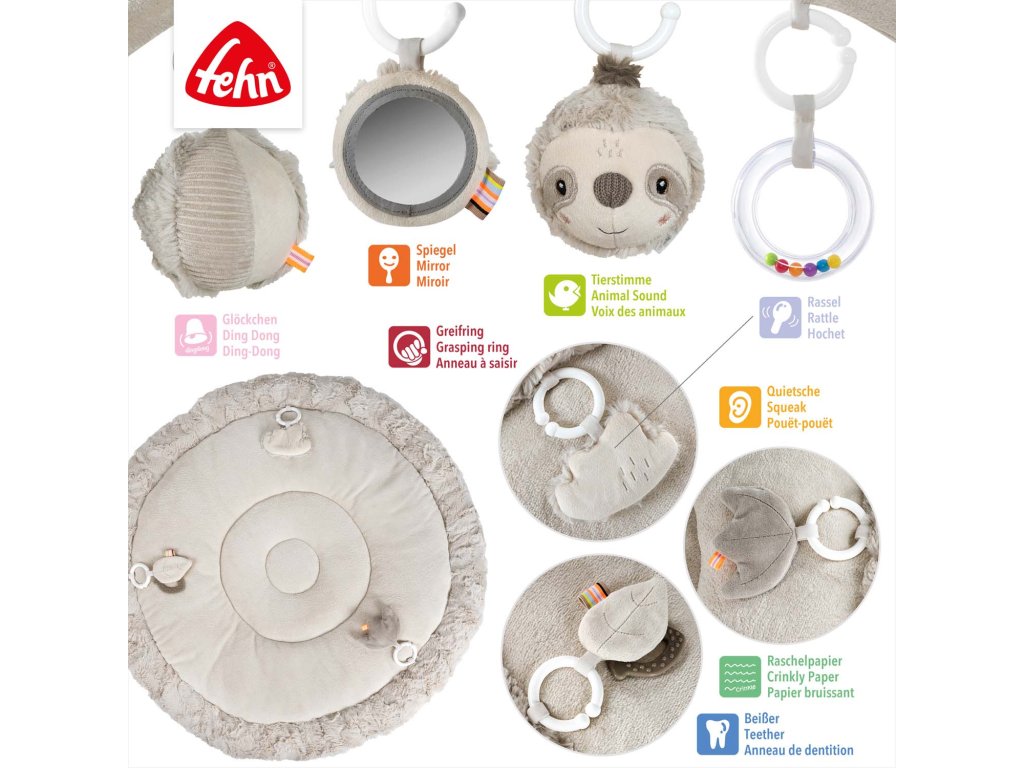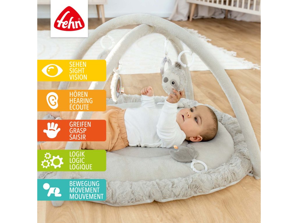 Hrací deka s hrazdičkou a 5 odnímatelnými hračkami zabaví a podporuje vývoj během ležení, sezení i lezení. Určeno pro miminka od narození a batolata.Interaktivní deka s lenochodem a prostorem na ležení z různých hebkých materiálů láká miminko k mazlení, zkoumání a hraní. Tři odnímatelné prvky se šusticím papírem, pískátkem a chrastítkem na dece podporují hmatové vnímání a koordinaci oko–ruka.