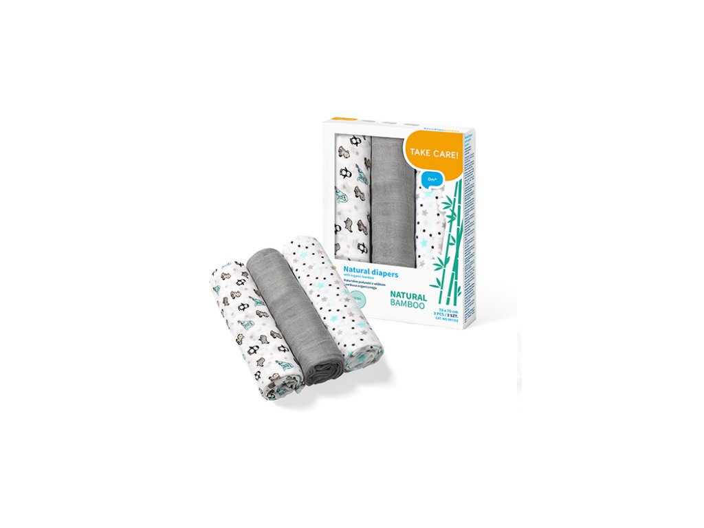 Plenky vyrobené z bambusových vláken lze použít od prvních dnů života - jako zavinovačka, lehká přikrývka, přebalovací podložka, prostěradlo nebo ručník. Jsou skvělé jako přikrývka během kojení nebo jako chrániče ramen rodičů, které chrání oblečení před deštěm. Mohou být také použity jako mazlení ke spánku nebo lehký kryt vozíku. Budou pracovat v jakékoli situaci, která vyžaduje blízkost k pokožce dítěte. Sada obsahuje 3 plenky: 2 z nich jsou zdobeny barevnými tisky, třetí je rovnoměrně obarvena. Jsou baleny v průhledném sáčku připevněném knoflíky.