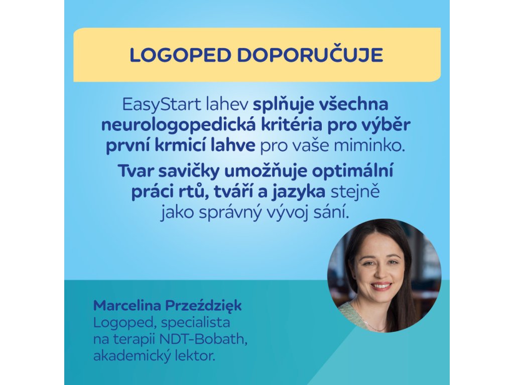 „Lahev EasyStart splňuje všechna neurologedická kritéria pro výběr nejlepší první kojenecké lahve pro vaše dítě. Tvar savičky umožňuje optimální fungování rtů, tváří a jazyka a také správnou tvorbu vzoru sání.