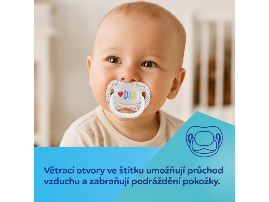 Špička symetrického tvaru je vyrobena z nejkvalitnějšího, bezpečného a jemného silikonu. Je bez chuti a zápachu, což miminku usnadňuje přijetí dudlíku. Tvarované větrací otvory ve štítku zajišťují volné dýchání a polykání slin. Speciálně navržený tvar štítku minimalizuje tlak dudlíku na jemnou tvář dítěte a zabraňuje tak jejímu podráždění.
