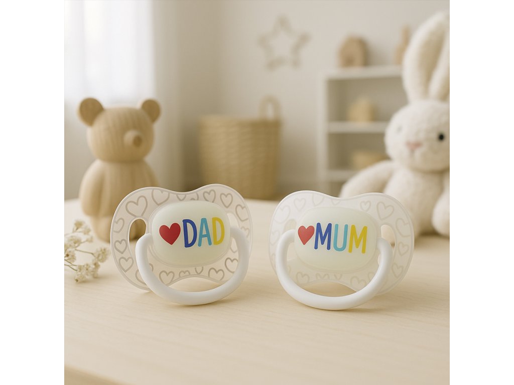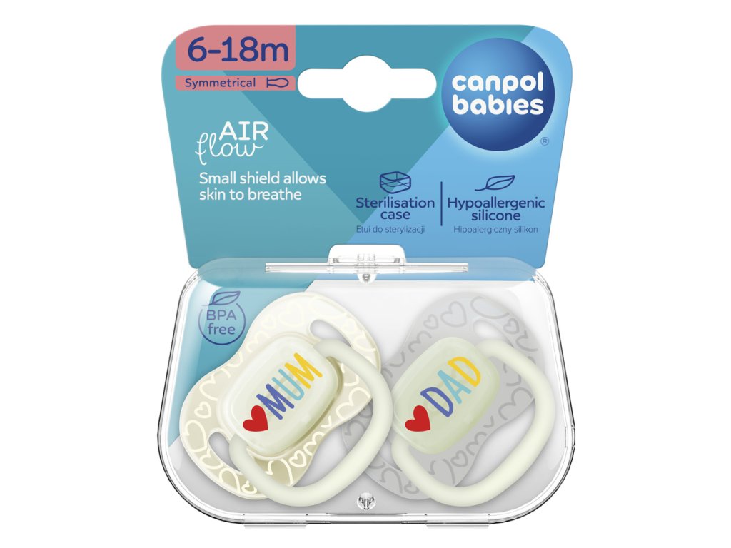 Canpol babies svítící dudlík z kolekce LOVE MUM&DAD přispívá k uvolnění a uklidnění vašeho miminka.