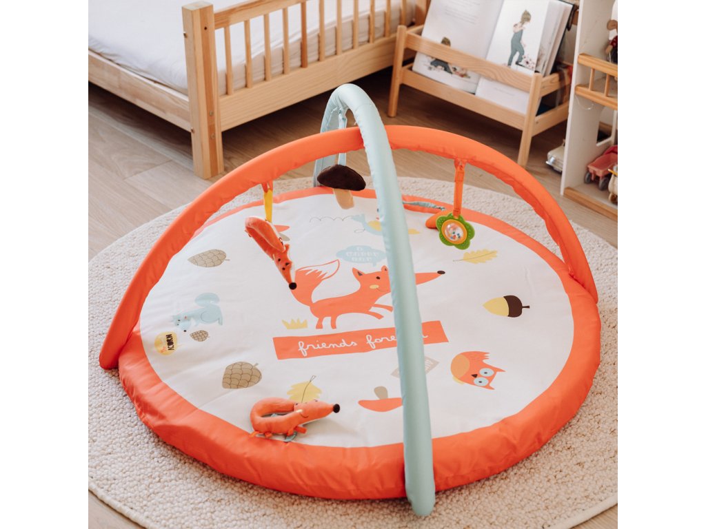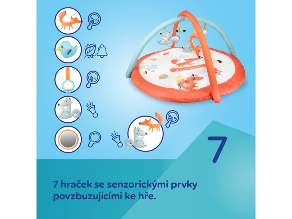 Barevná naučná hrací deka pro děti FOX je velmi praktická hračka pro vaše nejmenší! Tato hrací deka je výjimečně vysoká a měkká, poskytuje dítěti bezpečný prostor ke hře a objevování světa a dává pečovateli příležitost věnovat se domácím pracím, popíjet teplou kávu nebo si chvíli odpočinout, přičemž má dítě na očích. Sada obsahuje 7 hraček, které podporují rozvoj smyslových a motorických dovedností - 5 z nich je odnímatelných a lze je používat jako samostatné hračky. Různé smyslové prvky a zajímavé barvy jsou skvělou zábavou pro rozvíjející se smysly od prvních okamžiků života – zrak, sluch a hmat. Chrastítka, pískání a šustění stimulují sluch a různé textury stimulují hmat. Hračky připevněné k hrazdičce a dece povzbuzují dítě k aktivitě a natahuje se na ně. Zrcátko vzbuzuje zvědavost a prodlužuje dobu strávenou vleže na bříšku. Vzdělávací deka pro miminka je vyrobena z na dotek příjemných a bezpečných materiálů. Motiv lesních zvířátek navíc vaše děti jistě pozitivně naladí. Interaktivní deku FOX pro děti lze prát v pračce.