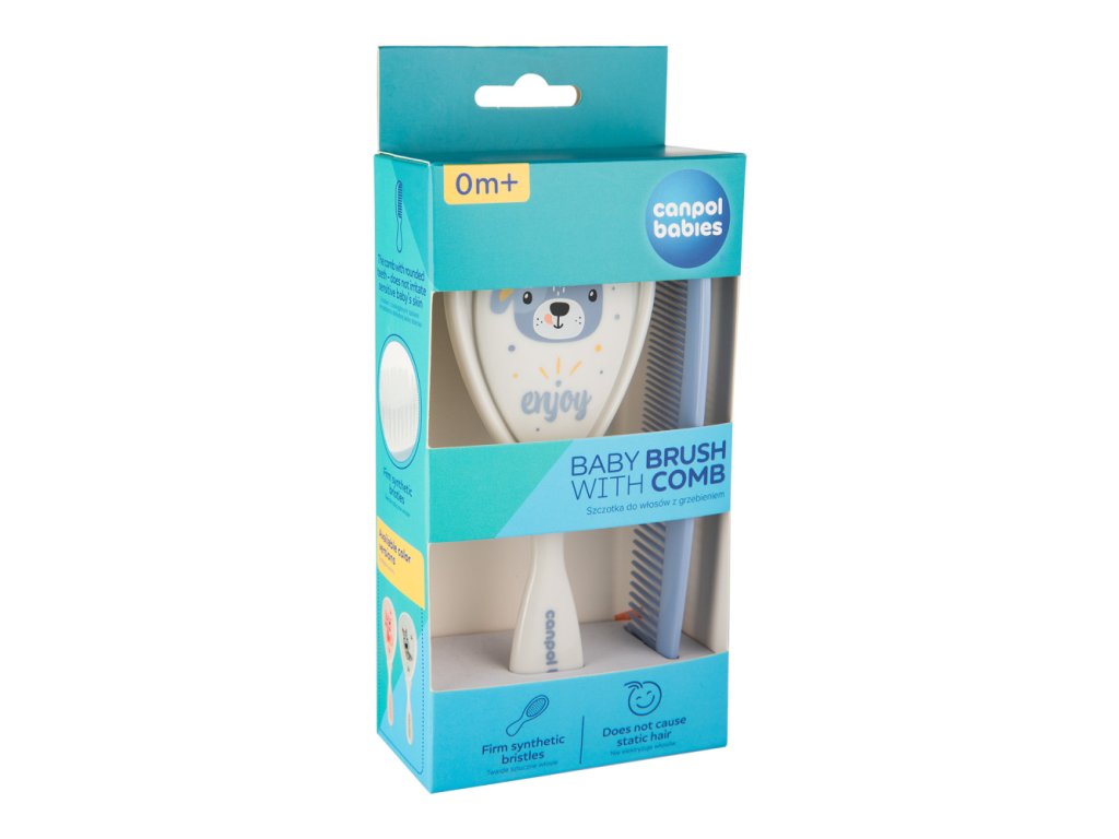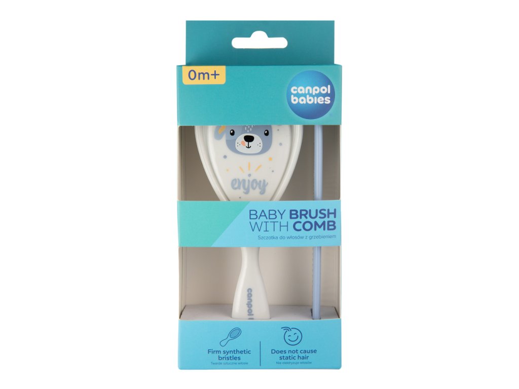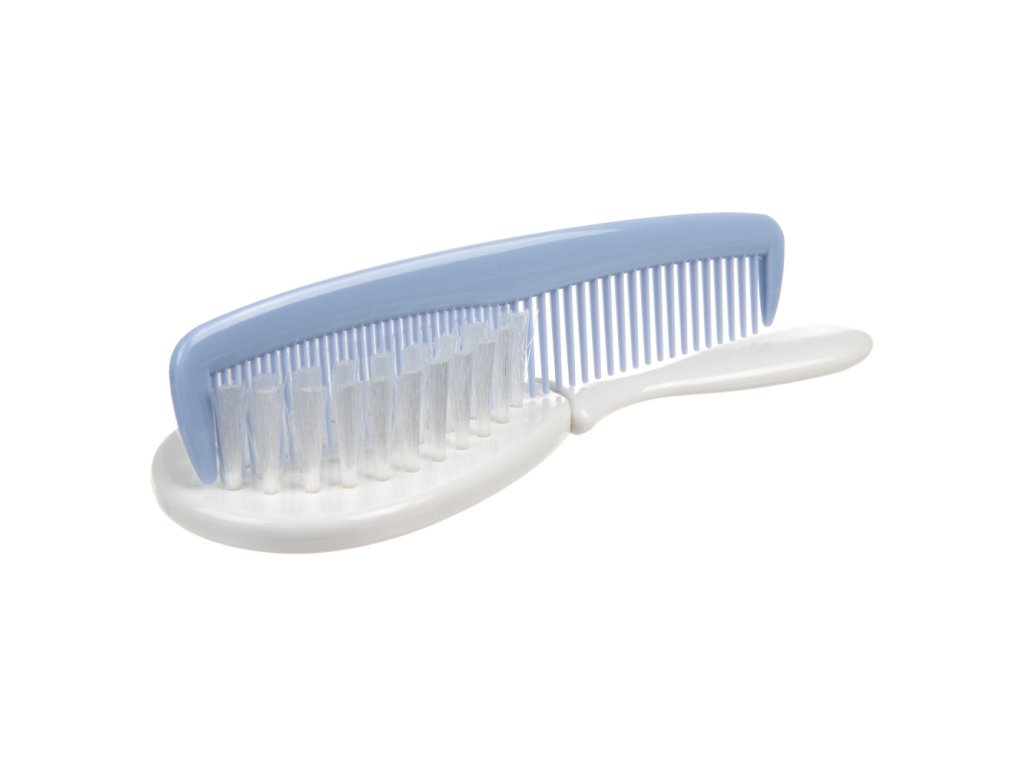 Kartáč na vlasy s hřebenem pro každodenní péči o vlasy děťátka. Hřeben má zaoblené zuby, které nedráždí citlivou pokožku. Kartáč s měkkými umělými štětinami jemně masíruje hlavu děťátka, aniž by mu elektrizoval vlasy. Sada je dostupná ve dvou variantách.