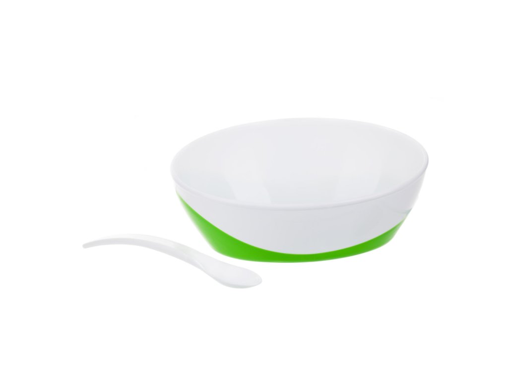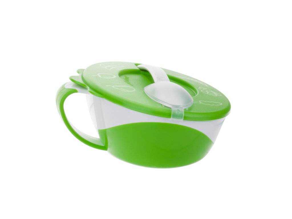 Lehká, barevná, praktická miska s lžičkou ve víčku je ideální jídelní pomůcka při každodenních procházkách nebo cestování. Lžička je hygienicky uzavřena v průhledném víčku. Protiskluzové dno zabraňuje klouzání misky po desce stolu. Díky pogumovanému ergonomickému oušku se miska dobře drží při krmení. Objem 350 ml. V balení 1 kus.