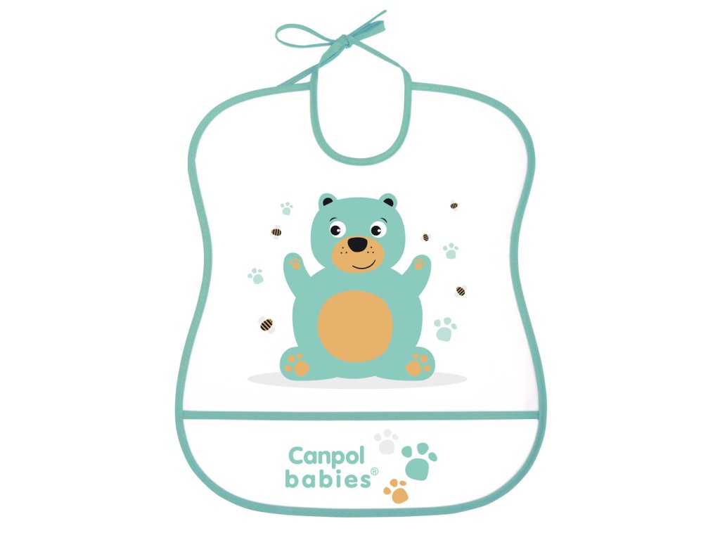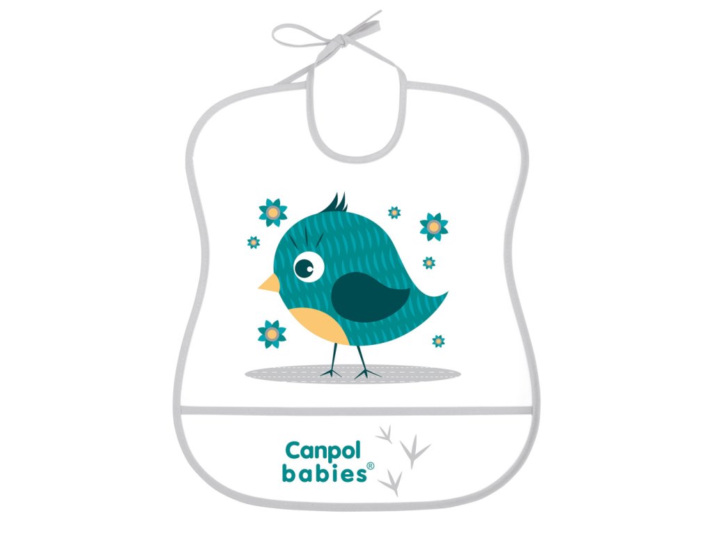 Praktický bryndák vyrobený z plastové fólie chrání oděv dítěte před ušpiněním. Speciální kapsa zachytí zbytky pokrmu. Dodává se v několika barevných provedeních. Čistěte vlhkým hadříkem nebo houbou. Snadno se udržuje v čistotě.