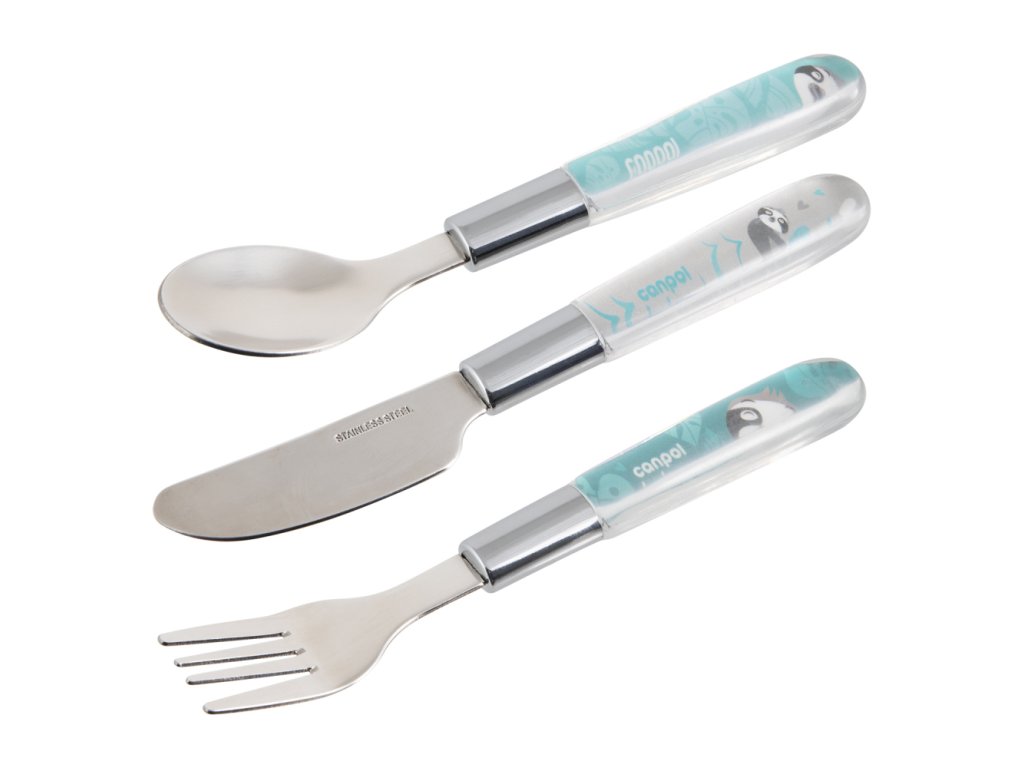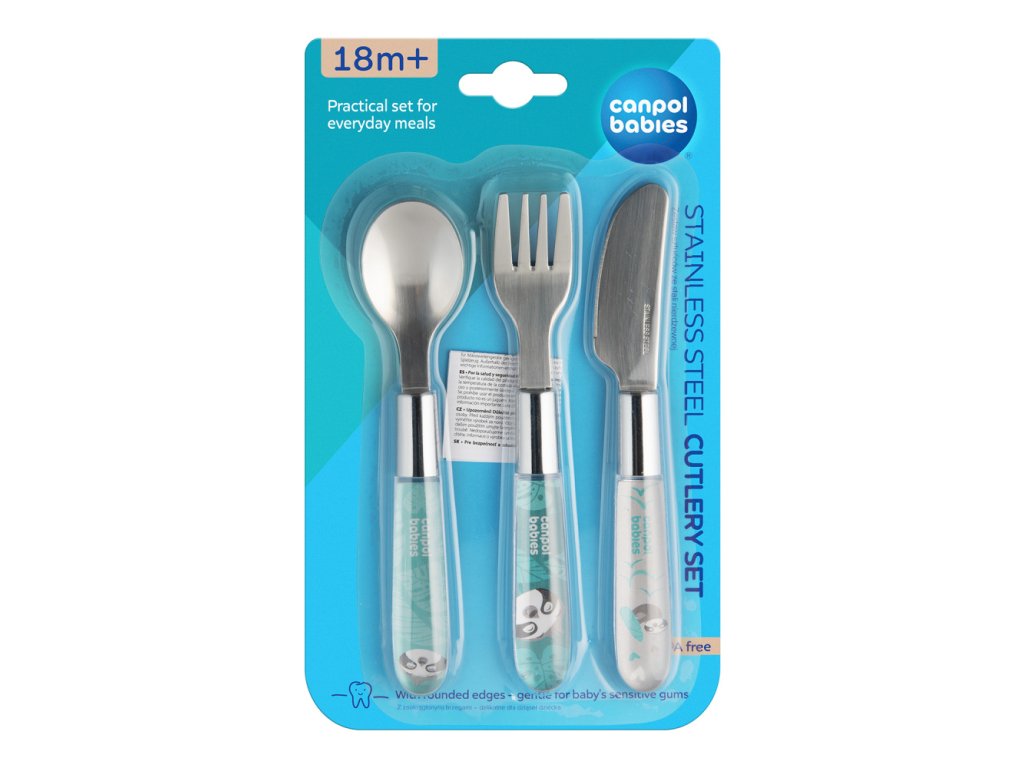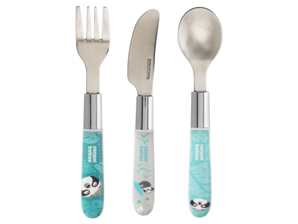 Speciálně tvarovaný dětský kovový příbor (nůž, vidlička, lžička) je určen dětem, které se učí samy jíst. Zaoblené tvary nedráždí cilivé dětské dásně a jsou pro dítě bezpečné. Příbor je vyroben z kvalitní nerezavějící oceli. Doporučujeme pro děti starší 18-ti měsíců.