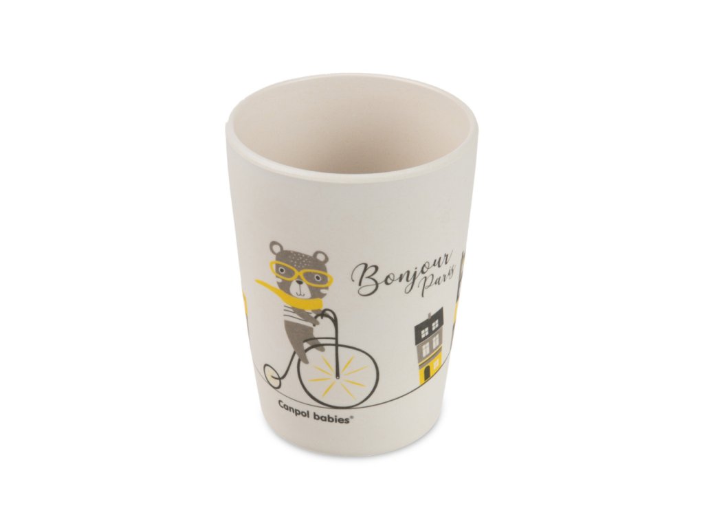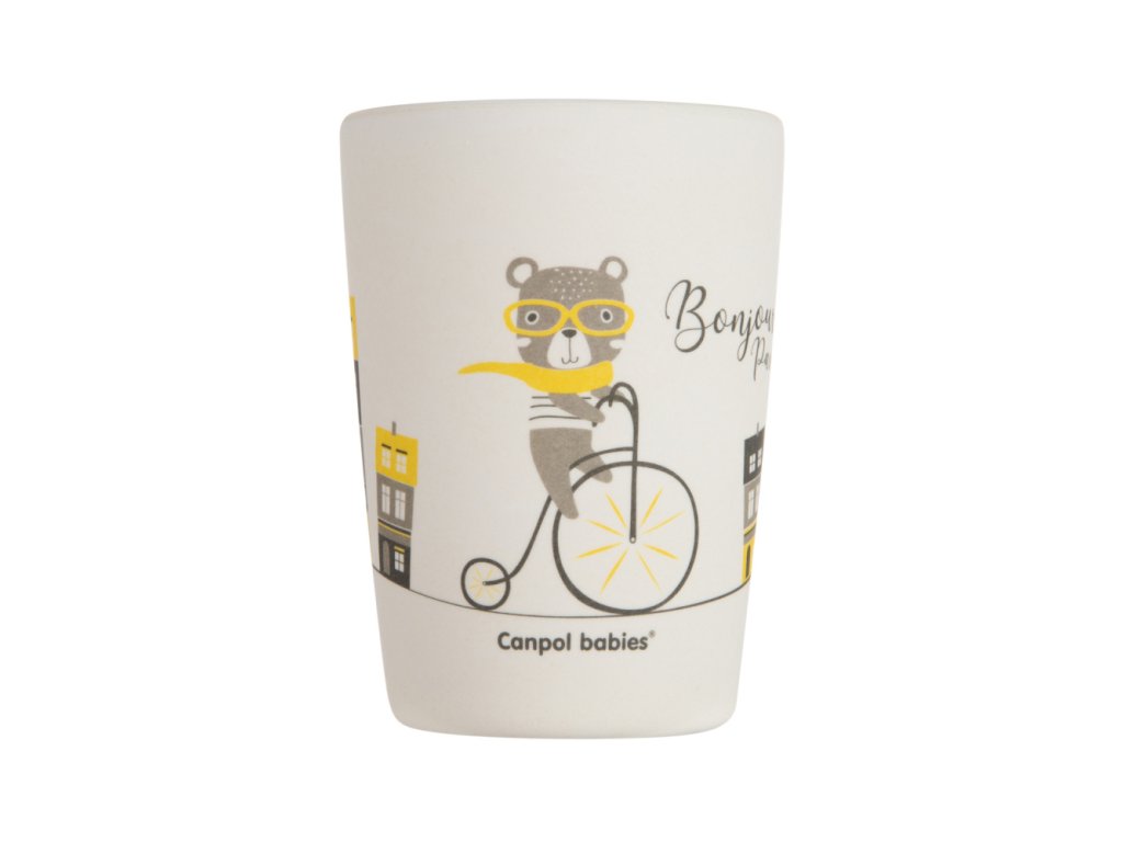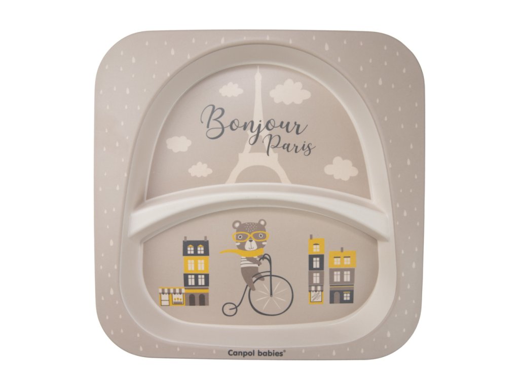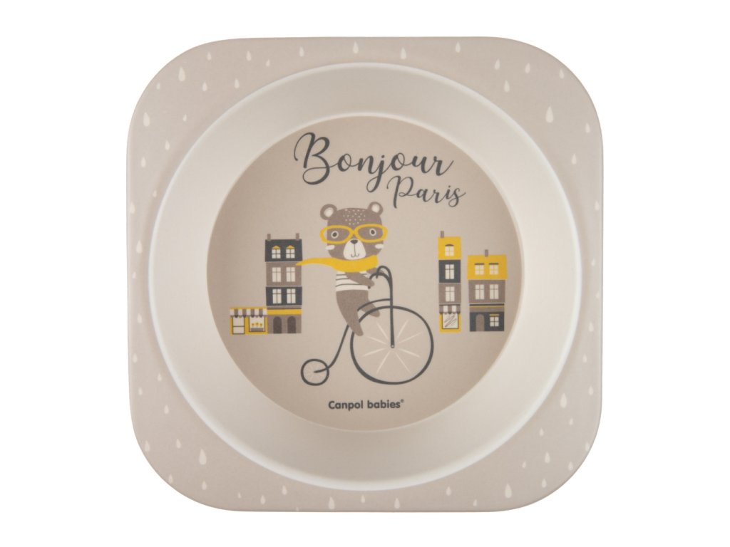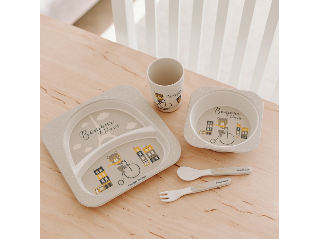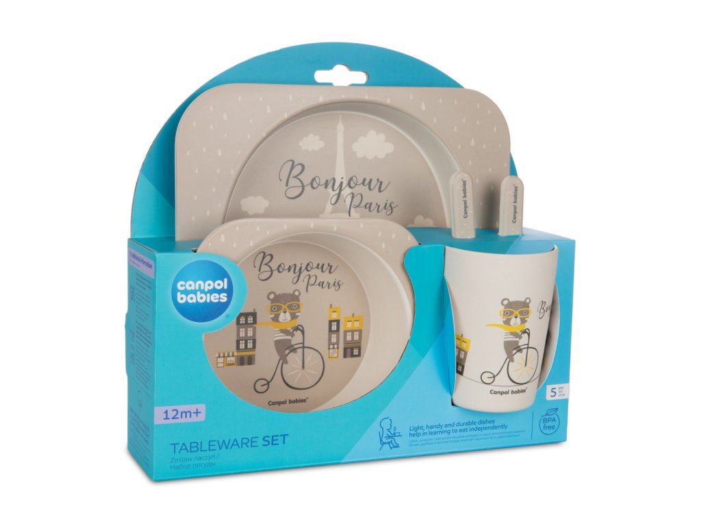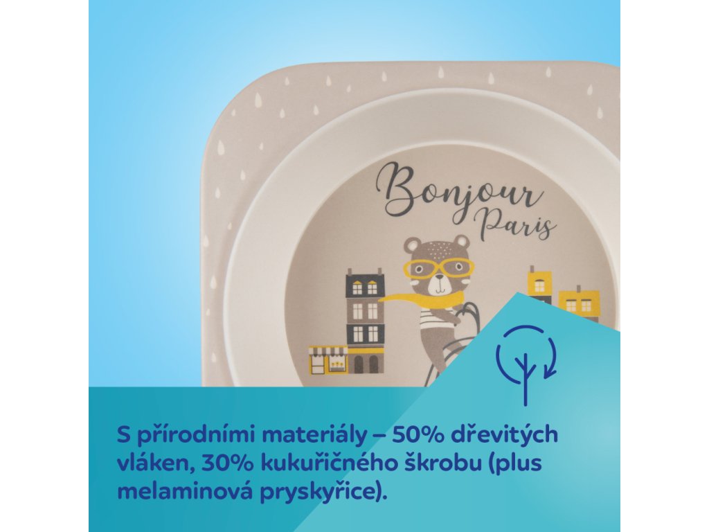 Sada nádobí BONJOUR PARIS je ekologickou alternativou klasických talířů a misek z plastu. Sada nádobí je vyrobena z pevného, odolného, nerozbitného materiálu vhodného pro styk s potravinami, za použití přírodních surovin – 50 % dřevitých vláken a 30 % kukuřičného škrobu (a 20 % melaminové pryskyřice).Sada obsahuje: talíř, misku, hrnek a příbor – vidličku a lžíci. Příbor má zaoblené hrany, díky čemuž je bezpečný pro dětská ústa a jemné dásně. Sada dětského nádobí BONJOUR PARIS s roztomilými potisky povzbudí vaše dítě k jídlu. Sada dětského nádobí Canpol babies z kolekce BONJOUR PARIS je ideální pro děti od 12 měsíců, které se učí samy jíst a pít. Lze mýt v myčce za použití nebarvených tablet do myčky a jemných mycích prostředků. Sada nádobí pro miminka BONJOUR PARIS se bude skvěle hodit doma, na dovolené nebo na pikniku.