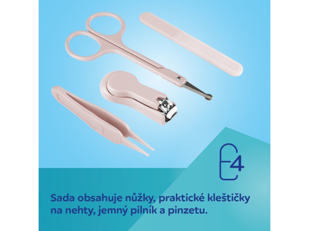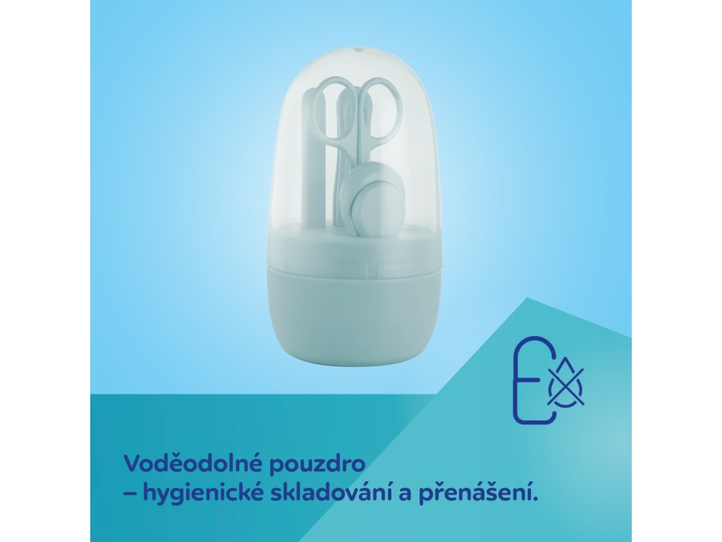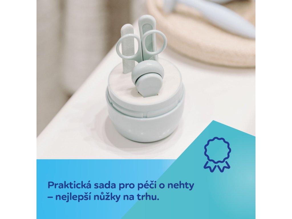 Sada obsahuje nůžky, praktické kleštičky na nehty, jemný pilník a pinzetu. Dostupné ve dvou barevných provedeních. Aby se minimalizovalo riziko neočekávaného pohybu dítěte, doporučuje se ostříhat nehty, když dítě spí. Sada není vhodná do myčky nádobí. Nevyvařujte, pro dezinfekci použijte vhodný dezinfekční prostředek a opláchněte vodou.