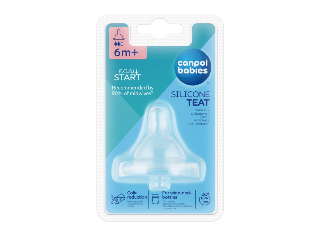 Protikolikový, silikonový dudlík na láhve se širokým hrdlem se velmi dobře odvzdušňuje a tím minimalizuje vznik dětské koliky. Podporuje správný vývoj skusu, řeči a dásní dítěte. Svým tvarem připomíná matčinu bradavku, umožňuje kombinovat krmení z láhve s kojením. Je vyroben z kvalitního silikonu, který se zcela bez chuti a bez zápachu a nemění chuť podávaného pokrmu. Dodává se v šesti velikostech průtoku. Při výběru velikosti dudlíku berte v úvahu také věk dítěte, jeho chuť k jídlu a druh podávaného pokrmu. V balení 1 kus.