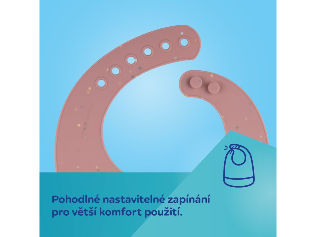 Tento výrobek není hračka. Uchovávejte mimo dosah dětí, když se nepoužívá. Nenechávejte bryndáček na přímém slunci, může vyblednout nebo prasknout. Možno mýt v myčce. Dostupné v několika barvách. Vhodné pro děti od 4m+.