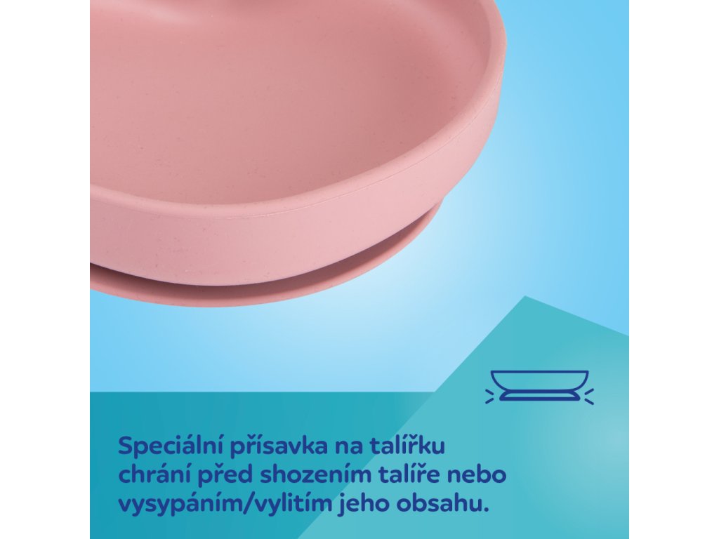 Speciální přísavka zabraňuje náhodnému převrhnutí nebo pádu talíře ze stolu.