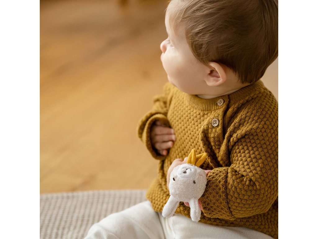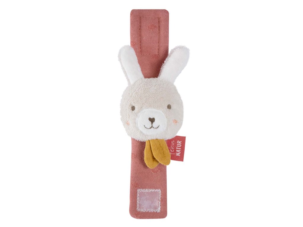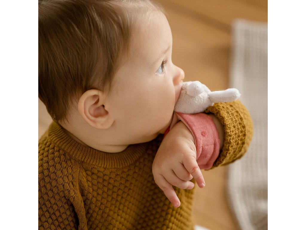 Snadno se nasazuje na ručičku, pří pohybu děťátka – třesení ručičkama vydává fascinující zvuky, které malé děti milují. Chrastící náramek hravou formou podporuje sluch, úchop a hmat miminka i jemnou motoriku.