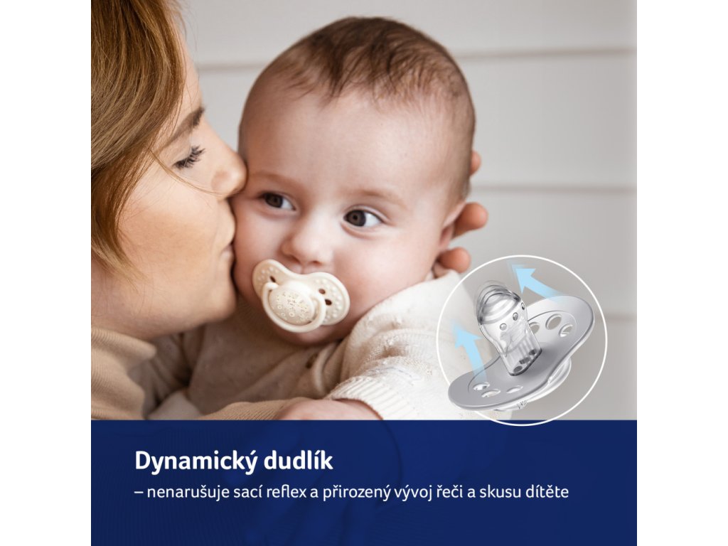 Tvar silikonové špičky je přizpůsoben přirozenému sacímu reflexu, silikonová část je úzká na začátku u štítku a rozšířená na konci tak, aby se špička natahovala a stahovala podle rytmu sání dítěte. Díky tomu je chráněn sací reflex miminek a sání dudlíku nemá nepříznivý vliv na kojení. Symetrický tvar špičky vychází z tvaru maminčiny bradavky naplněné mlékem, která poskytuje miminku důvěrně známý pocit podobný pocitu sání z prsu. Špička je zploštělá a konec dudlíku je tak tenký, že umožňuje dítěti volně zavírat ústa a správně pracovat dásněmi při sání a zároveň poskytuje dostatek prostoru v ústech pro práci jazyka, což snižuje riziko vzniku malookluze a vad řeči *.