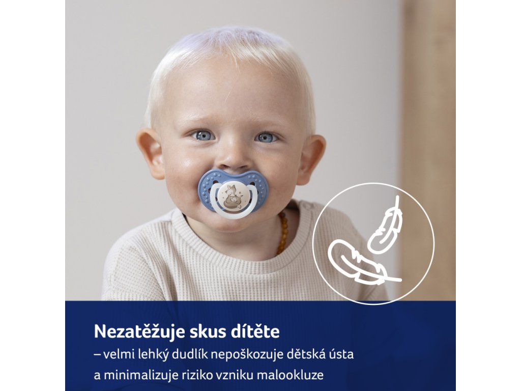 Umožňuje dítěti volně dýchat nosem. Je vyrobený z bezpečného materiálu, který neobsahuje BPA. Jedinečný okraj štítku je vyroben ze zdravotnického materiálu, je příjemný na dotek a zabraňuje otlačení dudlíku.