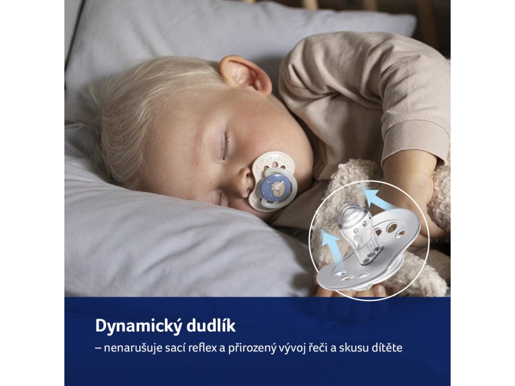 Silikonový dynamický dudlík LOVI® navržený s pomocí neurologopedů. Jedinečný design: heterogenní silikon a symetrický tvar inspirovaný bradavkou. Nenarušuje sací reflex a přirozený vývoj řeči a skusu miminka*.