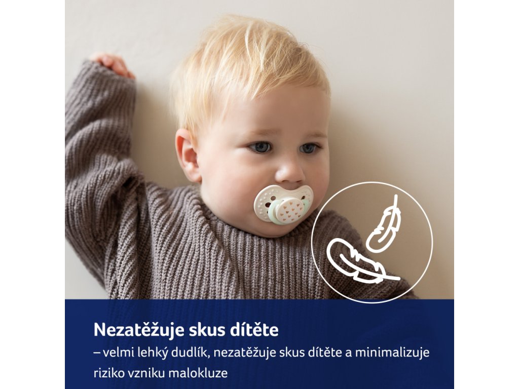 Velmi lehký dudlík, nezatěžuje skus dítěte a minimalizuje riziko vzniku malokluze.