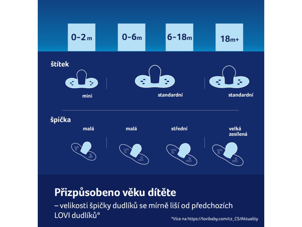 Velikost sací části je přizpůsobena věku a fázi vývoje dítěte, liší se od velikostí sacích částí u standardních dudlíků LOVI.