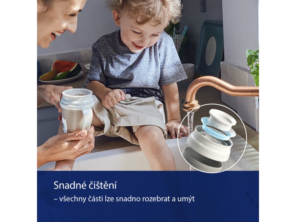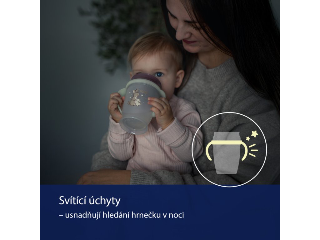 Náustek má antibakteriální ochranu díky speciální přísadě Saniconcentrate™, která redukuje bakterie až o 99,99%*. Tvarované úchyty jsou navrženy tak, aby se vešly do malých dětských ručiček a navíc svítí ve tmě, což usnadňuje hledání hrnečku v noci.