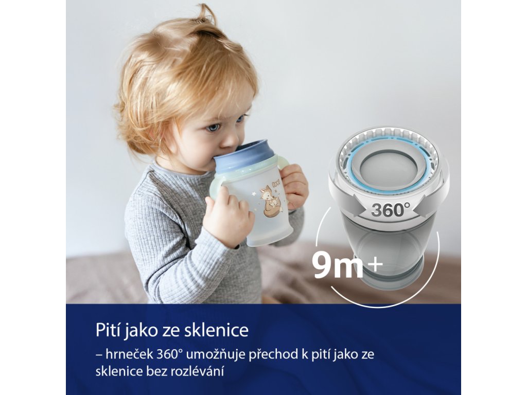 Naučit se pít jako dospělí. Hrneček 360° NIGHT&DAY je ideální pro děti, které jsou připraveny pít samy. Díky svému inovativnímu těsnění umožňuje nasávání tekutiny odkudkoli kolem okraje. Dítě si tak zvykne na přirozený, dospělý způsob pití, například jako z otevřeného hrnečku a ze sklenice, ale bez rozlití.