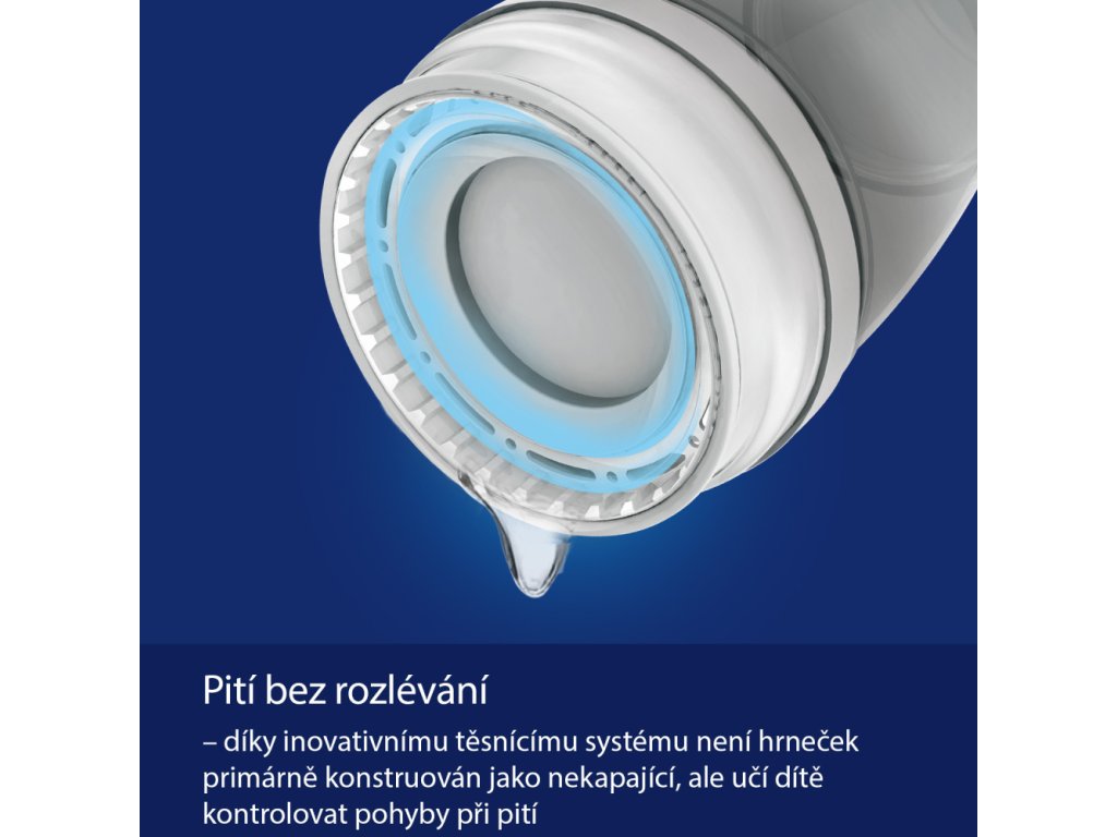 Umožňuje pití bez rozlévání, ale není primárně konstruován jako nekapající hrneček (při silném zatřesení nebo upuštění na zem tekutina vykapává) - učí dítě kontrolovat pohyby při pití a připravuje ho na pití z otevřeného hrnečku nebo skleničky.