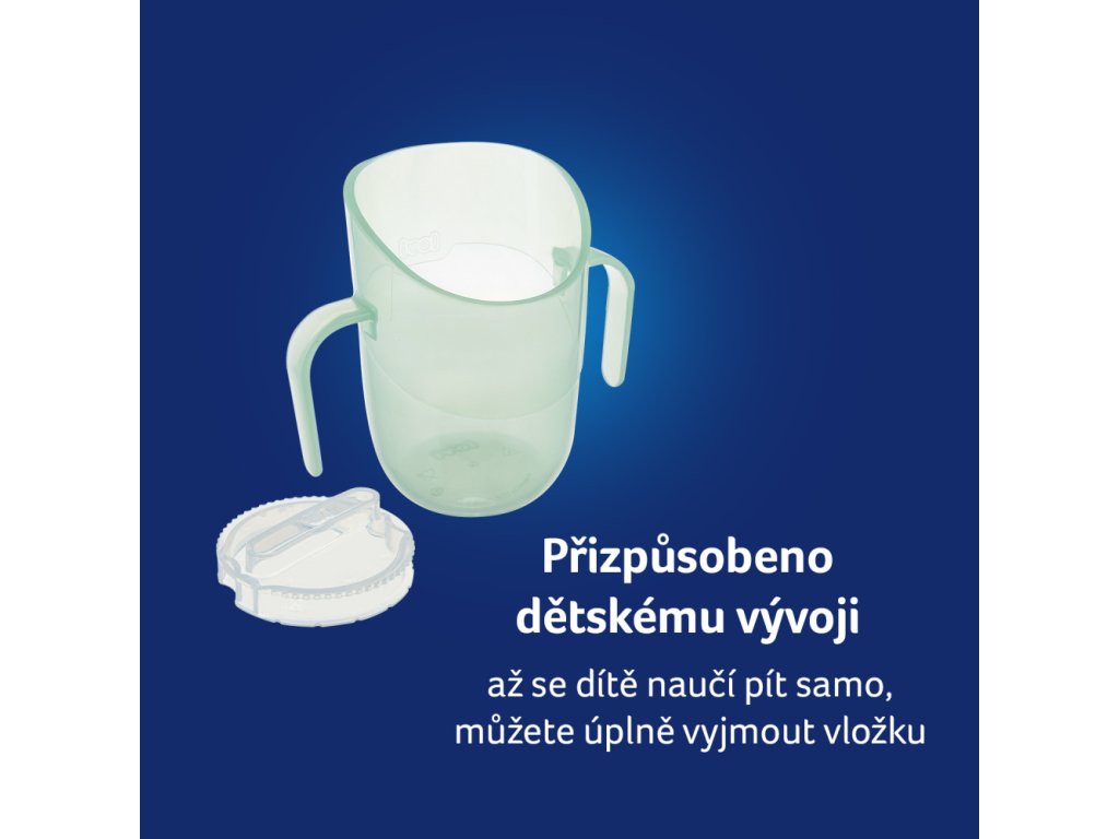 Přizpůsobeno vývoji dítěte – jakmile dítě zvládne pít z hrnečku samostatně, lze vložku vyjmout a dítě může pít už z otevřeného hrnečku.