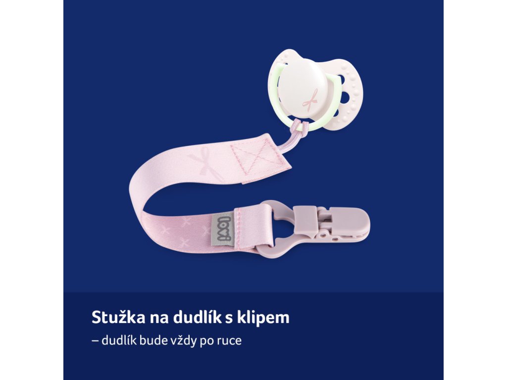 STYLOVÁ A PRAKTICKÁ! To je stužka na dudlík od značky LOVI z roztomilé kolekce BABY SHOWER. Látková stužka s klipem slouží k pevnému a stabilnímu připevnění dudlíku k oblečení miminka a chrání tak dudlík před ušpiněním nebo ztrátou.