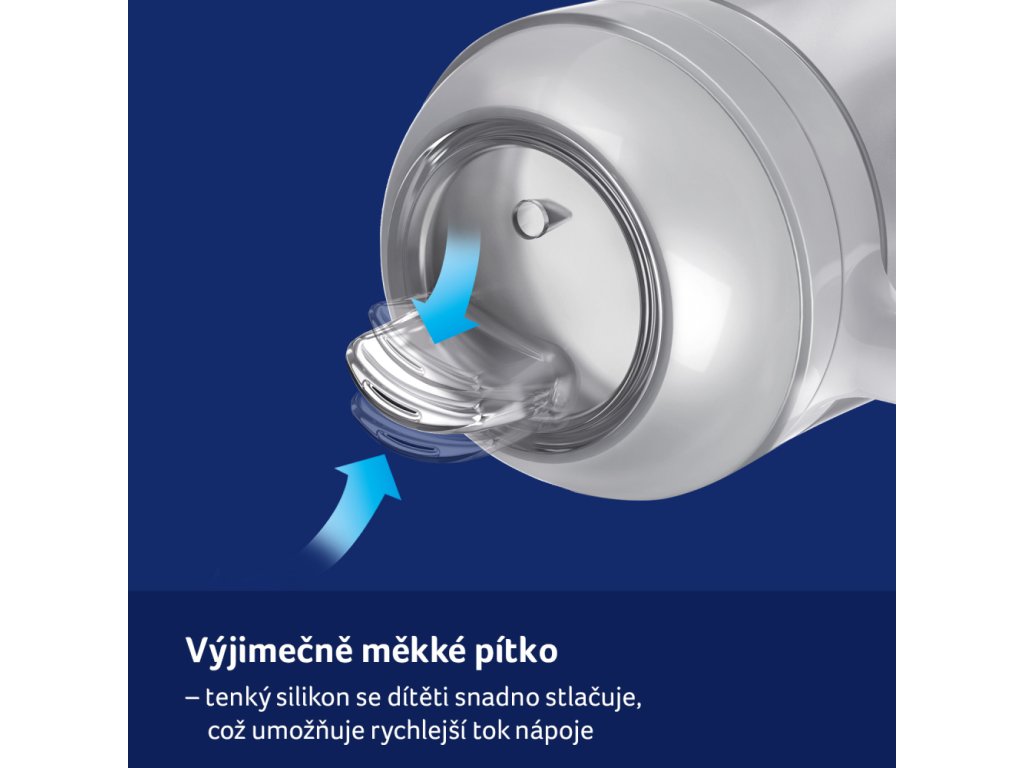Extrémně měkké pítko - vyrobeno z velmi tenkého silikonu, který usnadňuje dítěti jej stisknout natolik, aby tekutina vytékala rychleji