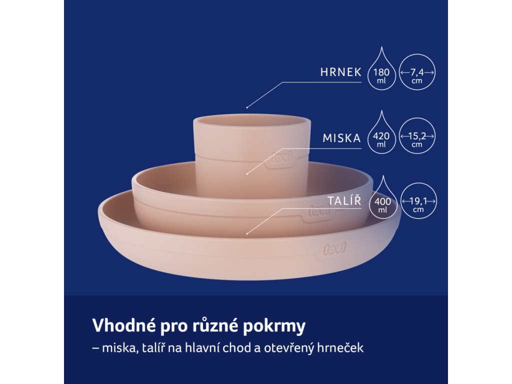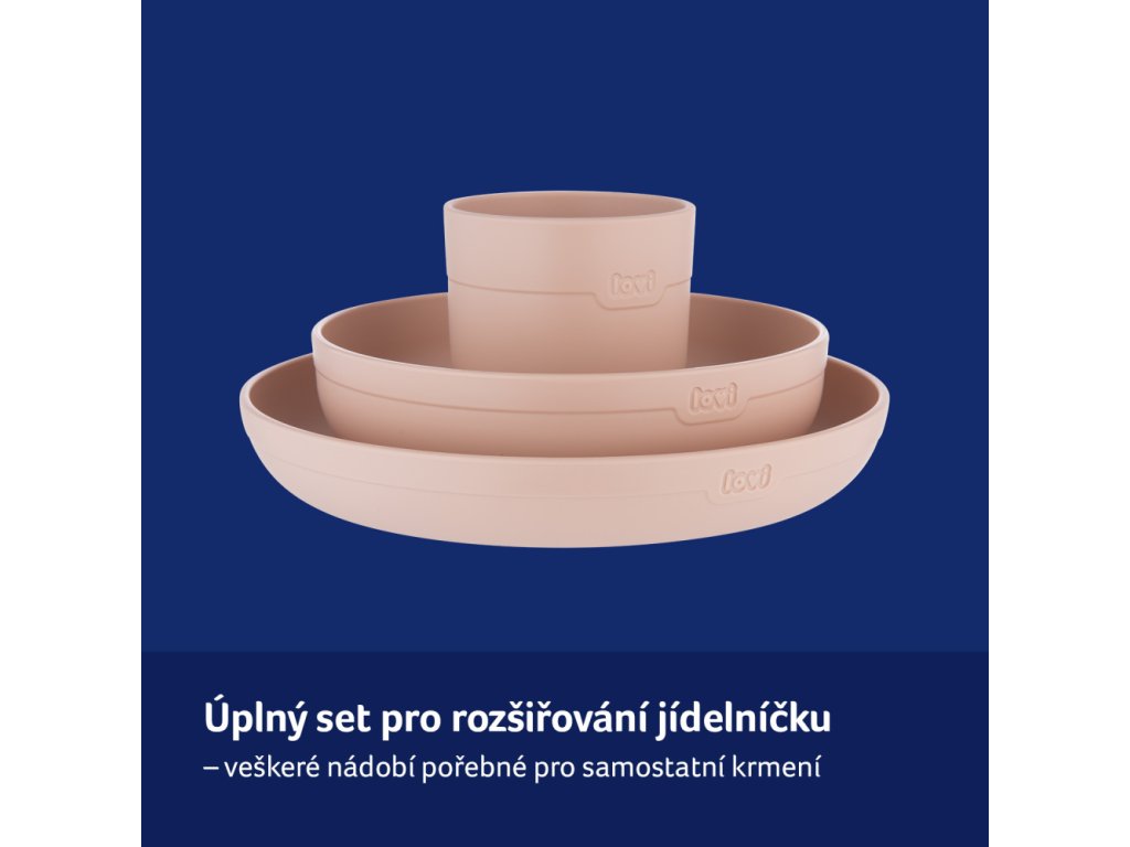 Sada nádobí LOVI obsahuje misku, talíř a hrneček. Vše, co je potřeba k rozšíření jídelníčku dítěte. Nádobí LOVI je ideálním produktem pro samostatné stravování dítěte – miska a talíř jsou vhodné pro různé pokrmy a hrneček je skvělým pomocníkem pro učení se pít z otevřeného hrnku.