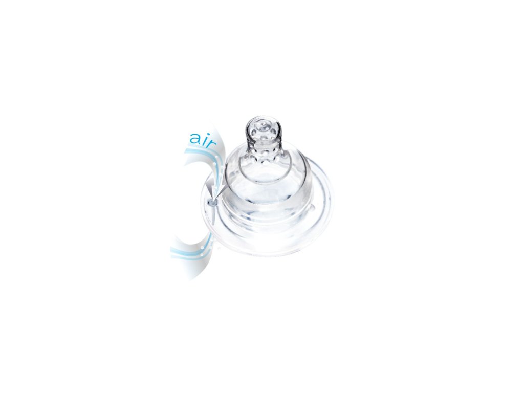 Odvzdušňovací systém v podobě speciální čočky v savičce zabraňuje vzniku podtlaku, minimalizuje vznik dětské koliky.