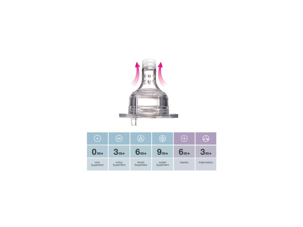 Odvzdušňovací systém „SUPER VENT” zabraňuje vzniku podtlaku, minimalizuje vznik dětské koliky.