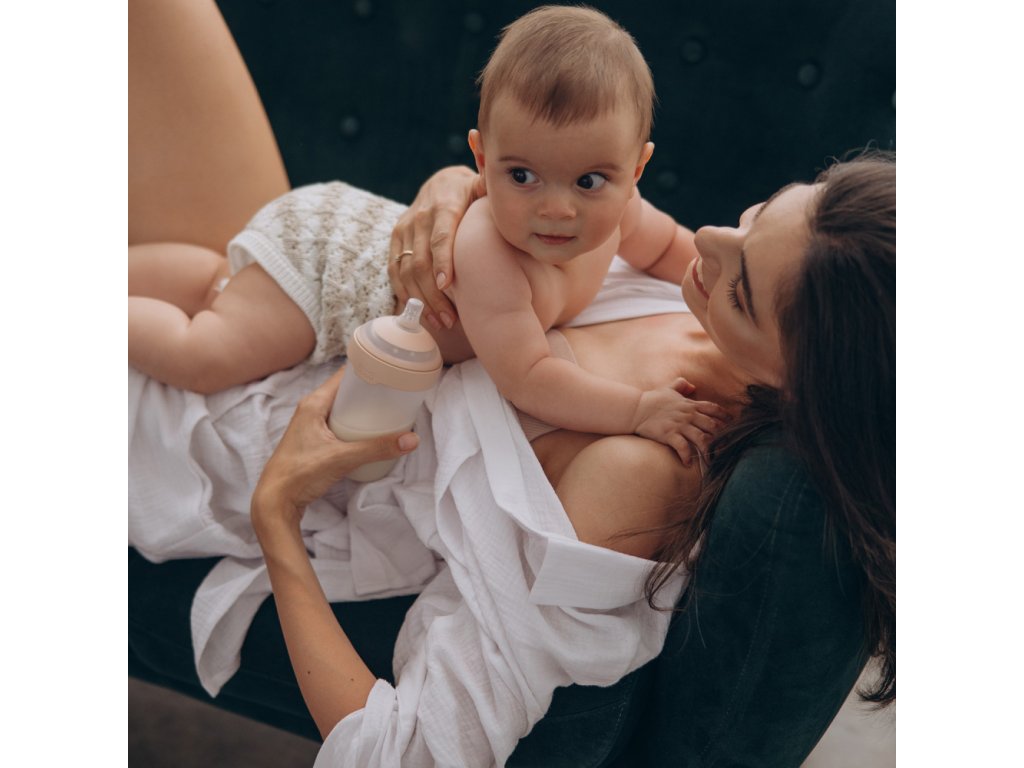Široký, profilovaný tvar po vzoru mamčiných prsou a dokonalé proporce zajišťují, že ústa dítěte jsou umístěna ve správném úhlu, rty jsou pevně sevřené a dítě může volně dýchat nosem, což snižuje riziko vzniku koliky.
