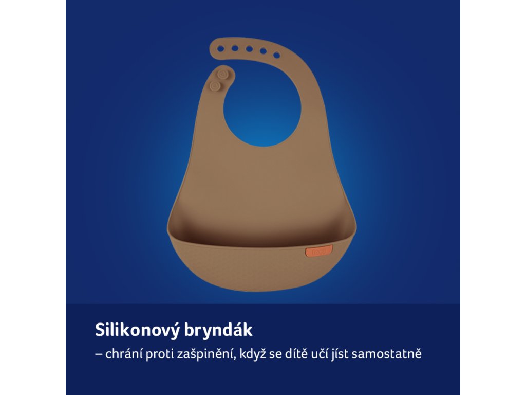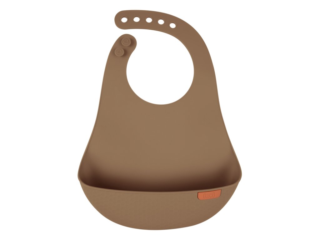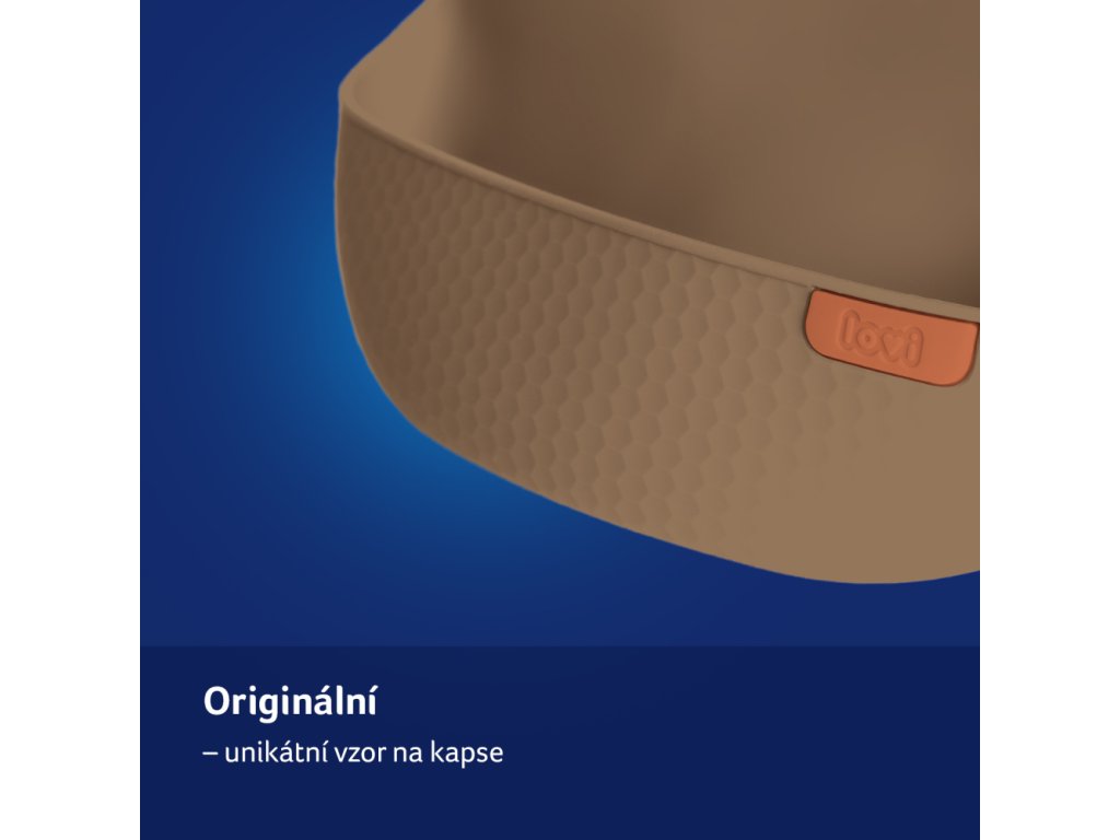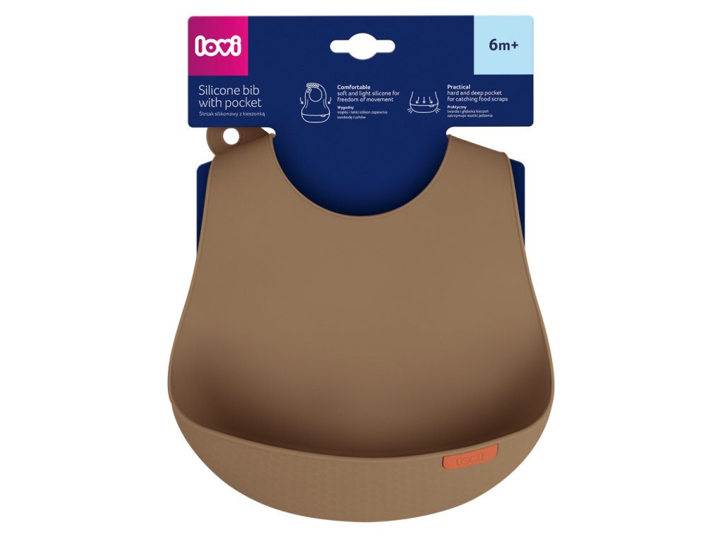 LOVI Silikonový bryndáček s kapsou je velkým pomocníkem pro rodiče - chrání před nečistotami v době, kdy se dítě učí samostatně jíst. Je vyroben z lehkého, měkkého a bezpečného silikonu. Pevná a hluboká kapsa zachycuje zbytky jídla, pohodlně obepíná bříško a zasahuje doširoka do boků miminka. Nastavitelná spona a ergonomický tvar bryndáku, zejména jeho tvarované strany, zajišťují volnost pohybu. Bryndáček má originální design díky unikátní struktuře kapsy a také se snadno čistí a je vhodný do myčky.