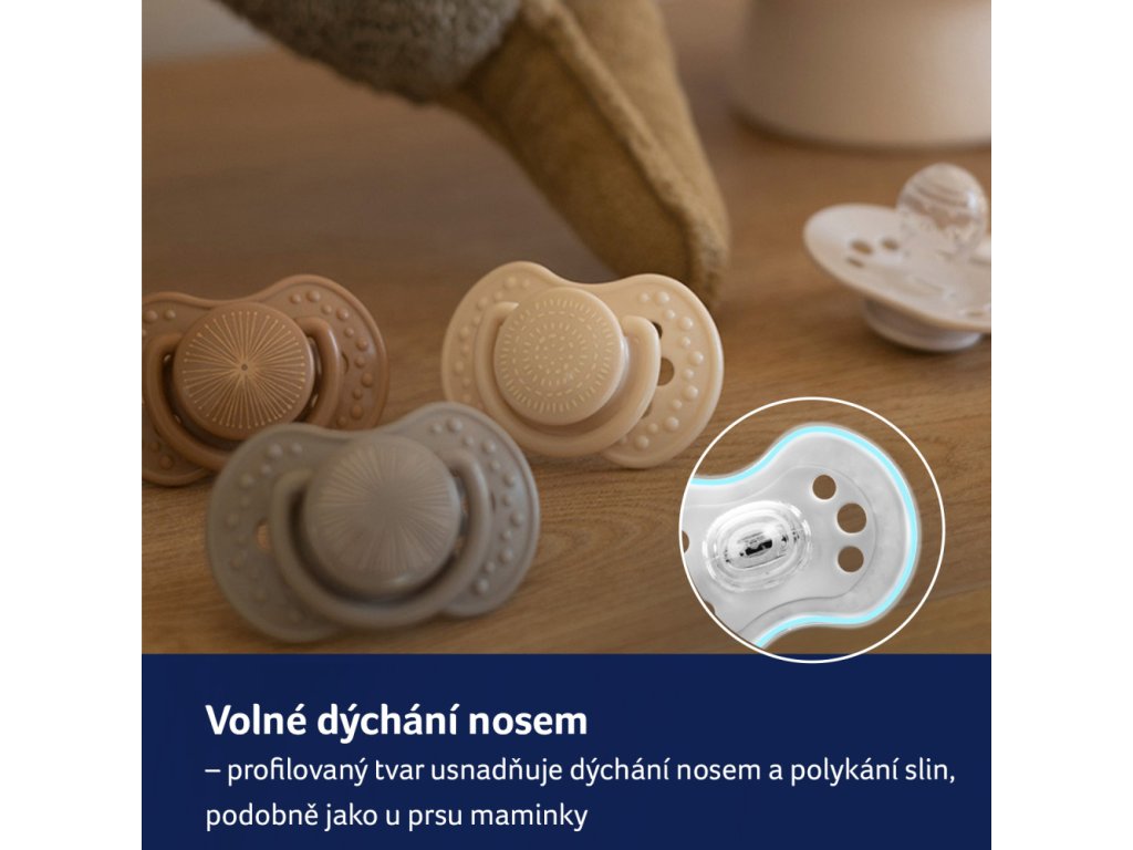 Jeho tvar umožňuje dítěti snadno dýchat nosem; jsou použity bezpečné materiálu bez bisfenolu A.