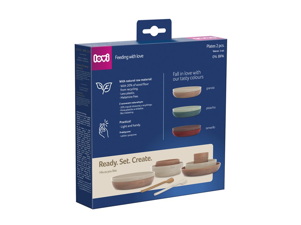 Výrobky LOVI jsou lehké, praktické, snadno se drží a mají bezpečný, oválný tvar, takže je mohou používat děti i rodiče. Na výrobu talířků jsme použili 20% recyklovaných dřevitých vláken, díky čemuž je v jejich složení méně plastu a hlavně jsou tyto produkty bez melaminu a BPA.