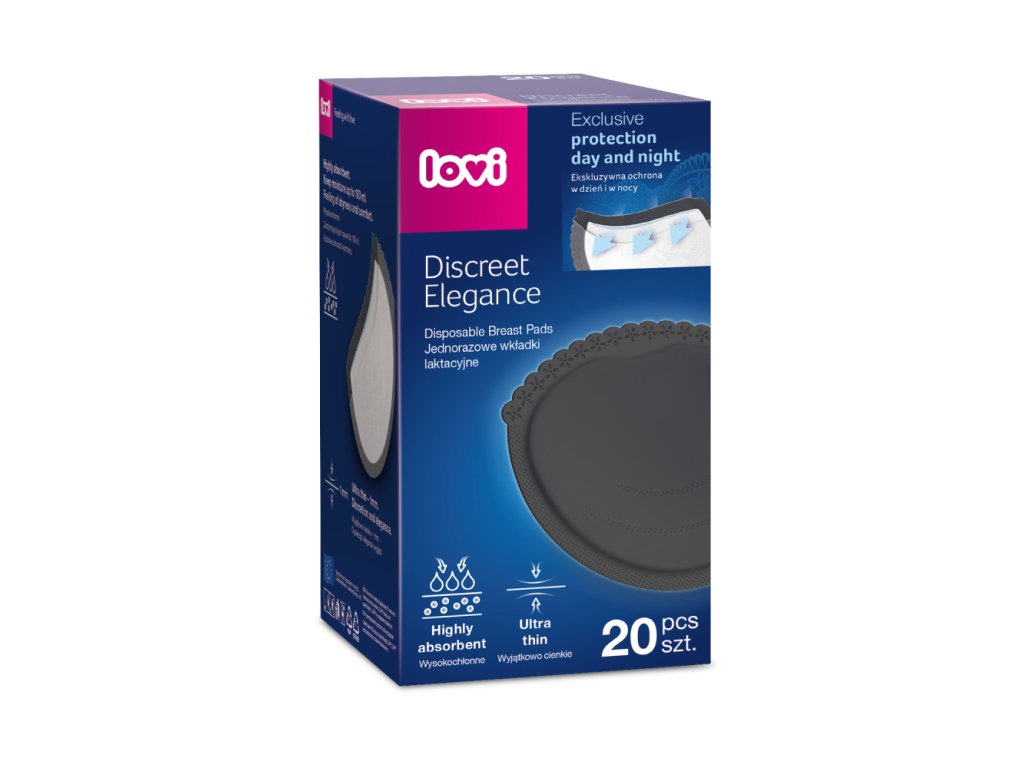 Jednorázové vložky do podprsenky LOVI Discreet Elegance jsou určeny kojícím matkám. Vložky chrání prádlo a oděv před ušpiněním vytékajícím mlékem. Profilovaný tvar ideálně přiléhá k prsu. Okraje zakončené krajkou jsou diskrétní a nedráždí pokožku. I když jsou tvořeny čtyřmi vrstvami, jsou velmi tenké. Měkká vnitřní vrstva nedráždí pokožku a udržuje ji v suchu. Dvě střední vrstvy zachycují vytékající mléko a mění ho na gel. Impregnovaná vnější vrstva zadržuje gel uvnitř vložky. Dvě samolepící pásky zabraňují klouzání vložky uvnitř prádla. Vložky dobře propouští vzduch. Každá vložka je z hygienických důvodů zabalen samostatně.