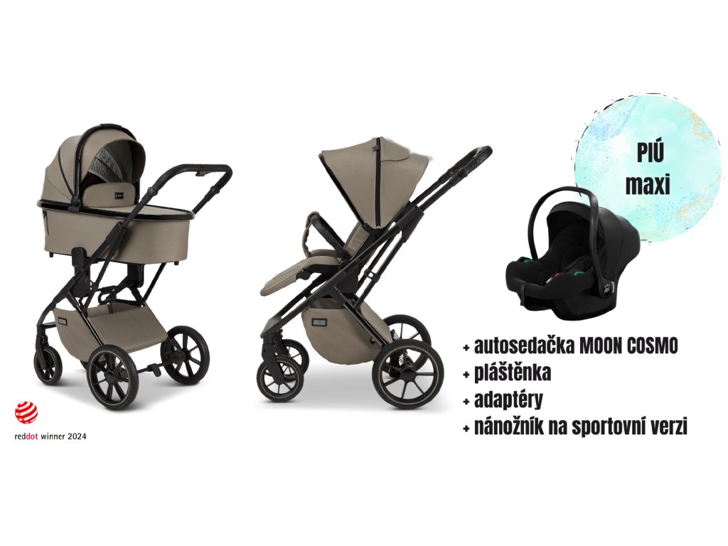 Kód: 64960632622, EAN: 4025583040122Kočárek MOON PIÚ vhodný od narození do 3 let, komfortní a lehká hluboká vana s rozepínatelnou stříškou s ventilační síťkou, hluboká vana s ventilačním odepínacím okénkem, exkluzivní prodyšná matrace PREMIUM firmy Träumeland, paměťové adaptéry pro snadné vyjmutí hluboké vany, prostorný sportovní sedák s rozepínatelnou stříškou a krytou ventilační síťkou, výškově nastavitelná zádová opěrka u sportovního sedáku s odvětráváním, polohovatelná opěrka zad a nohou až do úplného lehu, paměťové adaptéry u sportovního sedáku, opěrka nohou u sportovního sedáku nemá hranu, odnímatelné madlo před dítě s koženkovým potahem, výškově nastavitelná kloubová rukojeť, stříška hluboké vany a sportovního sedáku s UPF 50+ ochranou, sportovní sedák nastavitelný po i proti směru jízdy, polstrované bezpečnostní pětibodové pásy, přední gumová otočná kola s možností aretace, gumová zadní kola, prostorný úložný košík.https://www.babybusiness.cz/piu-black-chrome-mud/ Novinka: Paměťové adaptéry na hluboké vaně a sportovním sedáku Novinka: Výškově nastavitelná zádová opěrka u sportovního sedáku s odvětráváním Novinka: Opěrka nohou u sportovního sedáku nemá hranu Autosedačka Avionaut COSMO je mimořádně lehká. Váží méně než 3,2 kg a poskytuje pohodlí při každodenním použití. Cosmo je autosedačka určená pro malé cestující od prvního dne života. Speciální vnitřní vložka zaručuje správnou polohu dítěte a potah s vysokým obsahem bavlny zlepšuje cirkulaci vzduchu a zvyšuje komfort jízdy. Nezávislá stříška chrání dítě před slunečním zářením a dalšími vnějšími faktory. Splňuje nejnovější evropské bezpečnostní normy: i-Size a ECE-R129.Nánožník BLACK s odnímatelnou a pratelnou vložkou - rozměry: 44 x 36 x 14 cm (barva Black)Pláštěnku na hlubokou a sportovní část, adaptér na autosedačku Informace o výrobci MOON GmbHMaierhof 294167 TettenweisGermanyTel: +49 8532 92 43 0 www.moon-buggy.com E-mail: service@moon-buggy.comNávod a bezpečnostní upozorněníNávod PIÚ 2024 CZNávod PIÚ SK 2024Doplňkové parametry
