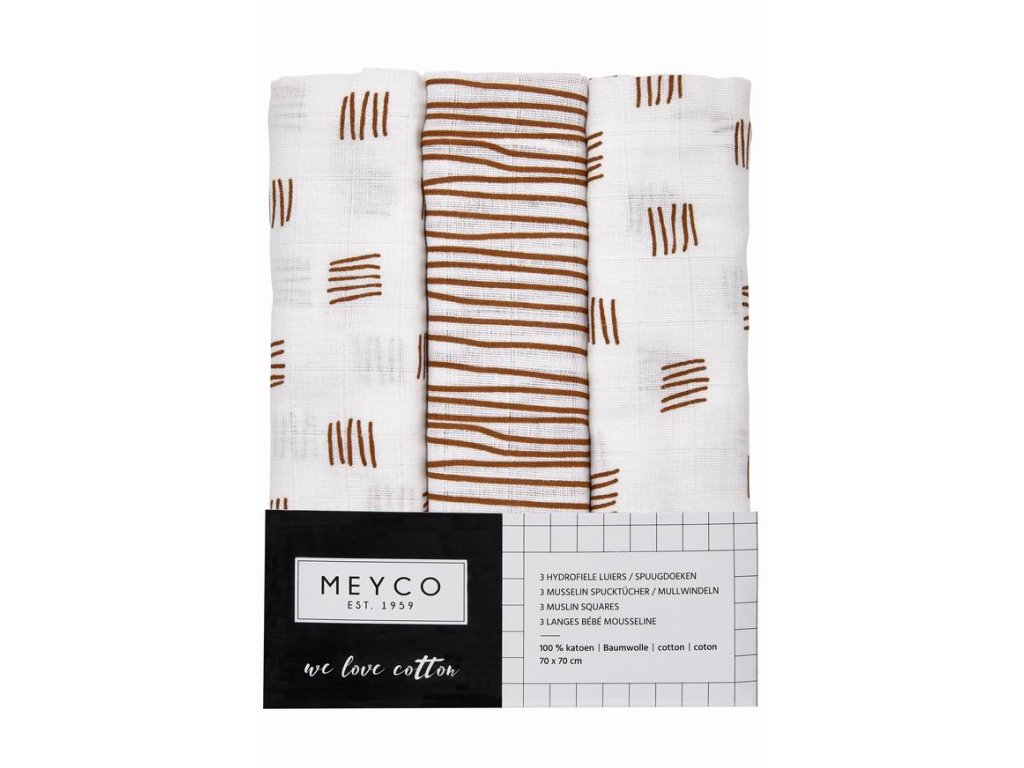 Materiál: 100% bavlnaBalení obsahuje 3 ks.Rozměr: 70 x 70 cmLze prát maximálně na 60 stupňů (extra hygienické)Vhodné do sušičkyLze žehlit (nevyžehlené přijímají více vlhkosti) Informace o výrobci MEYCO b-boo baby & lifestyle GmbHTackenweide 5446446 Emmerich am RheinGermany Phone number: +49 (0)2822 976500 https://www.meycobaby.com/E-mail: info@meycobaby.com Bezpečnostní upozorněníVýrobek není hračka. Nevystavujte blízkosti ohně. Plastový obal držte mimo dosah dítěte, hrozí nebezpečí udušení.Doplňkové parametry