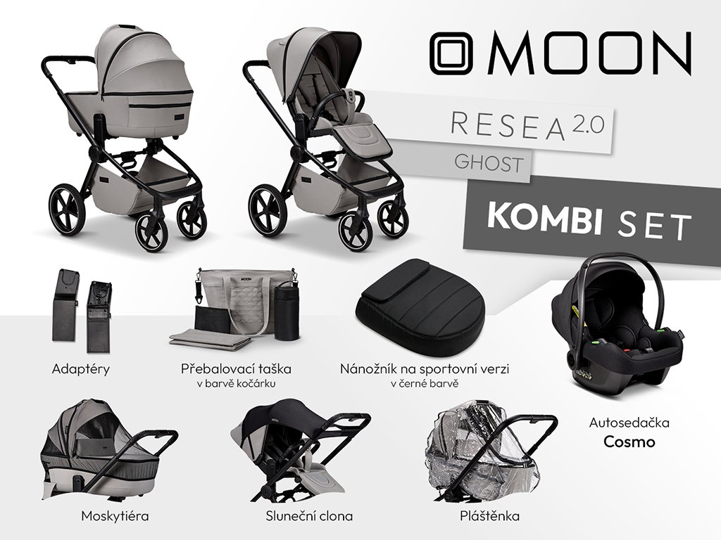 Hlavní funkce a benefityMaximální komfort pro dítě i rodiče Nosnost až 22 kg – kočárek poroste s vaším dítětem a vydrží opravdu dlouho. Otočné sportovní sezení – dítě může být otočeno k rodiči nebo po směru jízdy. Velká a prostorná korbička – ideální pro novorozence, s pohodlným vnitřním prostorem. Výškově nastavitelná opěrka zad – přizpůsobí se i větším dětem. Bez okrajová podnožka – poskytuje více prostoru a komfortu při sezení. Větrání a cirkulace vzduchu Dvě panoramatická okna s klimatickou zónou – zajišťují optimální proudění vzduchu a výhled. Odvětrávaná korbička i sportovní sezení – zabraňuje přehřívání v teplejších dnech. Skvělá mobilita a skladnost Lehký hliníkový podvozek s vysokou pevností – pevný a zároveň snadno ovladatelný. Super lehká kola s tlumením nárazů – vhodná do města i lehkého terénu. Otočná přední kola – pro maximální obratnost v úzkých uličkách nebo mezi regály v obchodě. Možnost složení i se sportovní sedačkou – ideální pro snadné uložení do auta nebo při cestování. Inteligentní řešení pro každodenní použití NOVINKA: Nastavení výšky korbičky a sedačky bez adaptérů – rychlé a jednoduché přizpůsobení bez nutnosti dalších dílů. Paměťová funkce – usnadňuje nasazení i sejmutí korbičky a sportovní části. Nákupní košík přístupný zepředu – pohodlný přístup a dostatek místa na všechny nezbytnosti. Integrovaná protiskluzová podnožka pro starší děti – pomáhá dětem bezpečně nastupovat a vystupovat. Pohodlné madlo na korbičce – snadné přenášení a manipulace. Reflexní pásky součástí kočárku – díky reflexním páskám bude vaše dítě vždy bezpečně viditelné i při nižší viditelnosti, což je důležité pro vaši klidnou mysl při venkovních aktivitách. Design a materiály Moderní interiér korbičky ve světle šedé barvě – elegantní a stylový vzhled. Látkový potah na korbičce – dodává šmrnc a měkkost. Exkluzivní barevné kombinace – díky kterým se RESEA 2.0 odlišuje od běžných kočárků. Vysoce kvalitní designové materiály a detaily – garantují nejen estetiku, ale i dlouhou životnost.Autosedačka Avionaut COSMO je mimořádně lehká. Váží méně než 3,2 kg a poskytuje pohodlí při každodenním použití. Cosmo je autosedačka určená pro malé cestující od prvního dne života. Speciální vnitřní vložka zaručuje správnou polohu dítěte a potah s vysokým obsahem bavlny zlepšuje cirkulaci vzduchu a zvyšuje komfort jízdy. Nezávislá stříška chrání dítě před slunečním zářením a dalšími vnějšími faktory. Splňuje nejnovější evropské bezpečnostní normy: i-Size a ECE-R129. Proč zvolit RESEA 2.0 v KOMBI SETU? S touto rozšířenou verzí získáte: Vše potřebné pro každé roční období Úsporu času i peněz – nemusíte vybírat a dokupovat příslušenství samostatně Stylově sladěné doplňky – ve stejném designu jako kočárek Pohodlí a připravenost bez kompromisů Je to skvělá volba pro rodiče, kteří hledají spolehlivý, moderní a kvalitní kočárek, který se snadno ovládá a zároveň dobře vypadá. Rozložený kočárek (D x Š x V) 96 x 57 x 114 cmSložený kočárek (D x Š x V) 65 x 48 x 26 cmHluboká vana (D x Š x V) 90 x 38 x 23 cmVnitřní rozměry sportovního sedáku (D x Š) 92 x 30 cmDélka opěradla sportovní sedačky 50/57 cmHmotnost včetně hluboké vany 11,4 kgHmotnost včetně sportovního sedáku 11,9 kgmax. hmotnost dítěte (sportovní sedačka) 22 kgVýškově nastavitelná rukojeť 93 - 104,5 cm Informace o výrobci MOON GmbHMaierhof 294167 TettenweisGermanyTel: +49 8532 92 43 0 www.moon-buggy.com E-mail: service@moon-buggy.comNávod a bezpečnostní upozorněníMOON_K26_Manual_RESEA2Upozornění RESEA 2.0 CZUpozornění RESEA 2.0 SKDoplňkové parametry