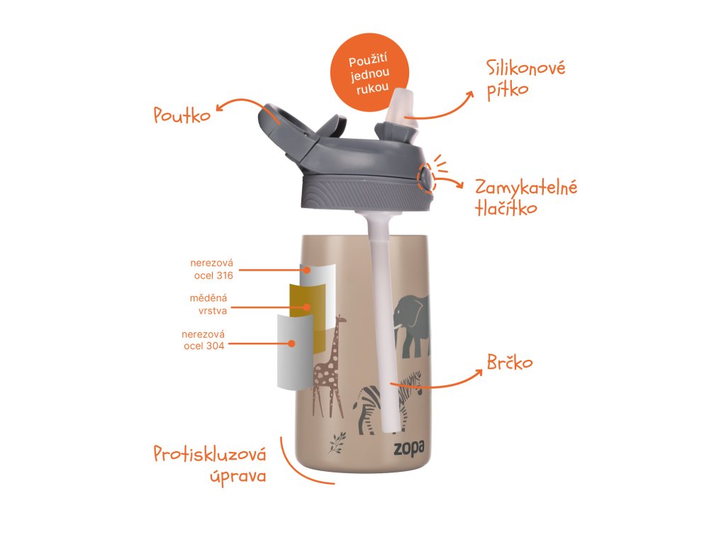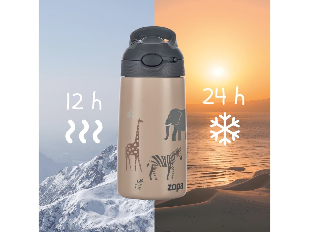 Dopřejte svému dítěti nápoj správné teploty po celý den! Naše sportovní termoska o objemu 400 ml je vybavena dvojitou stěnou a vakuovou izolací, která udrží nápoje teplé nebo studené.