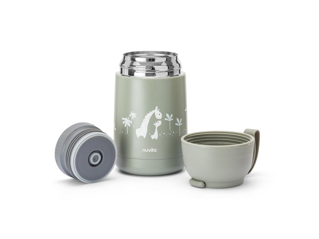 Termoska z nerezové oceli je ideálním společníkem na procházky či výlety s dětmi. Díky dvouplášťové konstrukci a technologii vakuové izolace udrží jídlo teplé až 12 hodin a nápoje studené až 24 hodin. Láhev má vzduchotěsný šroubovací uzávěr s tlakovým ventilem, který zamezuje úniku tekutin a zajišťuje stabilní teplotu. Praktické víčko lze použít jako kelímek a široký otvor usnadňuje čištění. Nastavitelná silikonová rukojeť umožňuje pohodlné připevnění k dětskému kočárku, zatímco protiskluzové silikonové dno je odolné proti poškrábání.